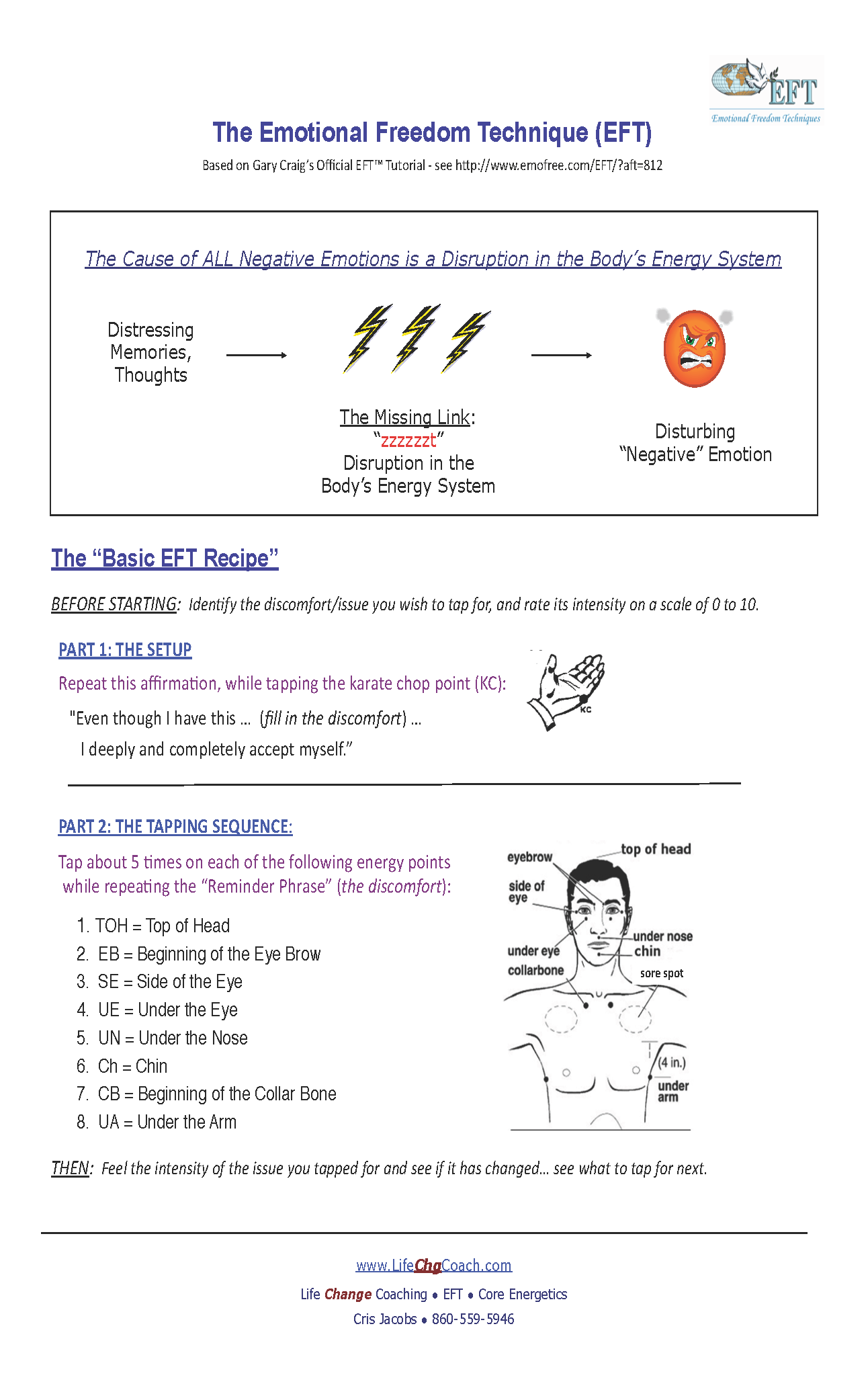 I’ve included several documents for your review and a video showing myself going through a simple tapping routine. Remember, some schools are very strict about wording, etc., while others are not, so don’t be confused when you see varying points of view on the documents. I want to expose you to all possibilities. I have seen the tool work without being so strict about the process, but you decide what works best for you and your clients.